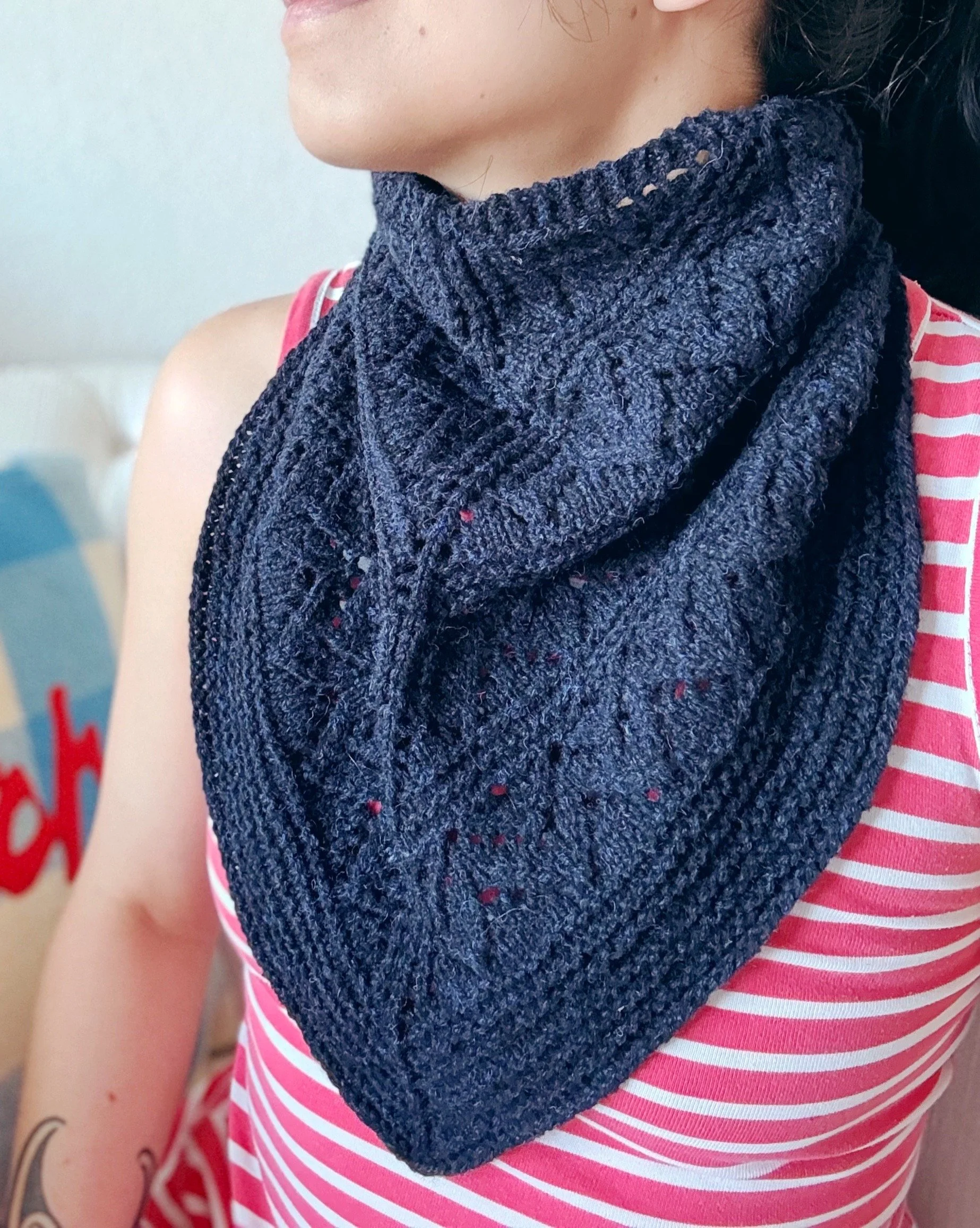 This bandana cowl is worked from the top down. The triangular shape is created by increasing 4 stitches on every right side row in the first section. The work is then joined in the round; the 2 yarn over increases at the edges stop, while the 2 increases at the center spine continue, allowing the cowl to grow in depth to the final border.